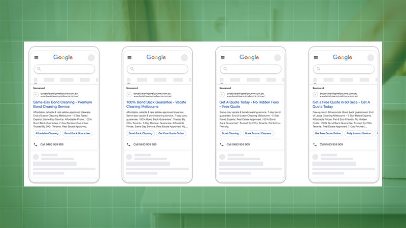 We highlighted key differentiators — same-day cleaning, bond-back guarantee, and affordable rates — across every page and ad.