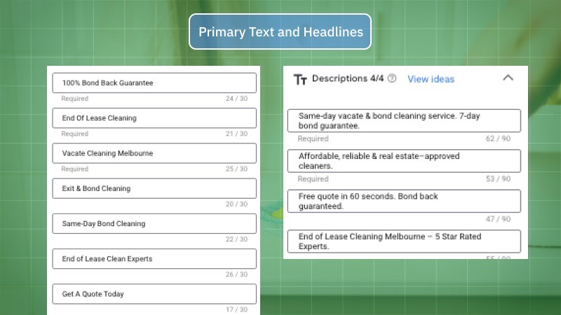 Our Google Ads used high-intent keywords like “vacate cleaning Melbourne” and “end of lease cleaning experts,” with clean copy and persuasive CTAs.