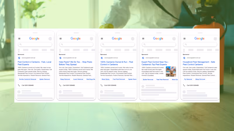 Geo fenced Canberra suburbs, layered with urgent intent queries like pest removal today and termite inspection now. Ad schedules prioritised peak home search hours, while mobile bids pushed calls and form starts.